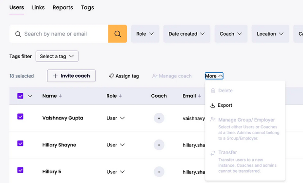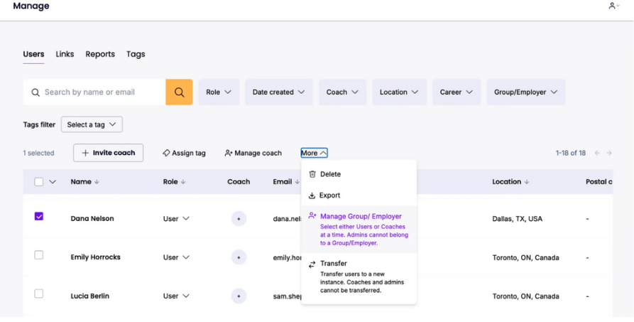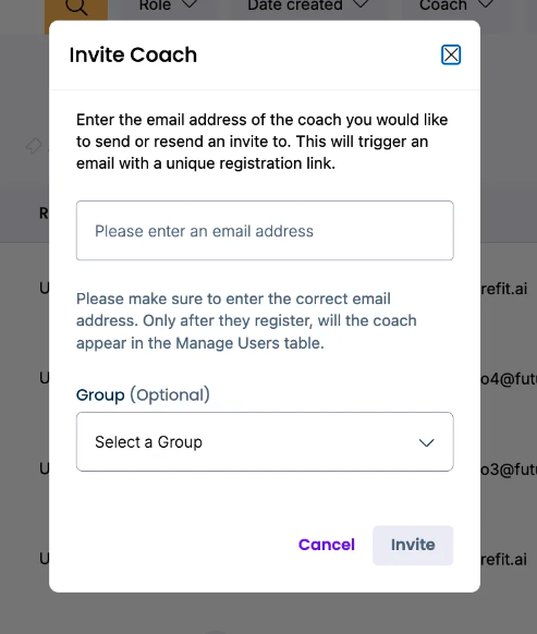 From the Manage Users Table, click the “+” sign under the coach column → choose the coach from the dropdown. They will receive an email notification.
