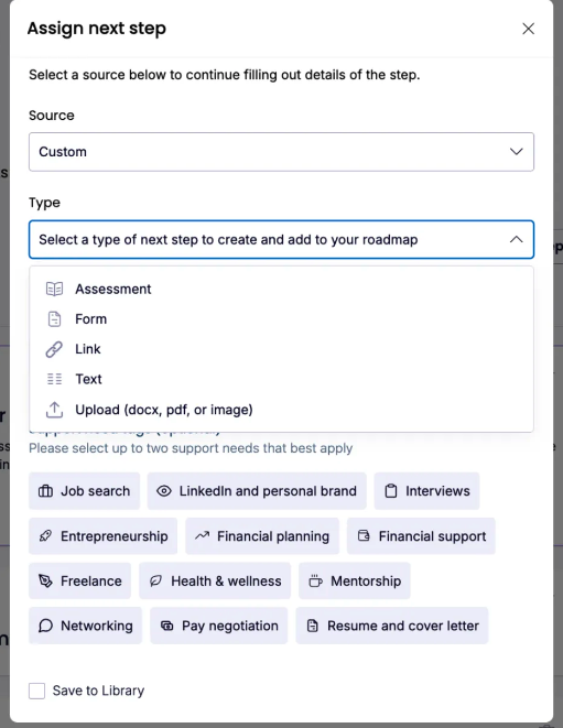 If you create a new roadmap step, you can save it to your library by checking the “Save to Library” box at the bottom of the form.