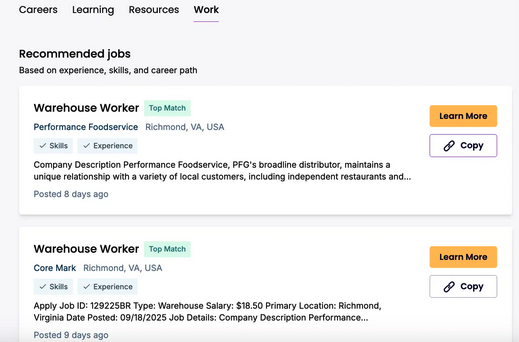 Here you can view what recommendations are visible to a given user in their job seeker account. This includes recommended careers, learnings, resources, and jobs. For jobs, you can copy a link to the job application to share directly with the user.